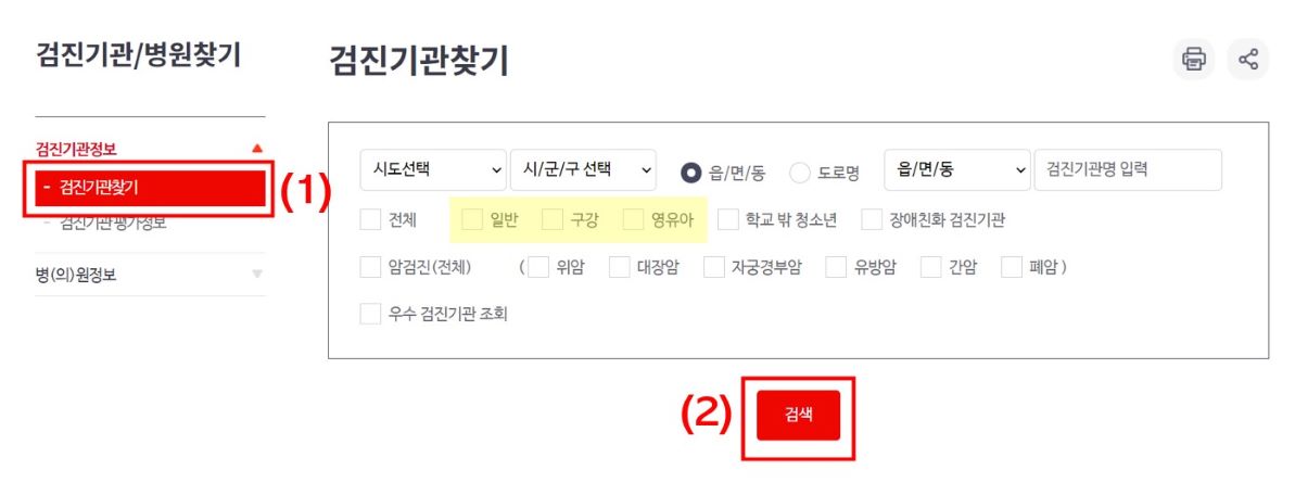 2) 검진기관찾기(1) > 원하는 지역 선택 > 구강 or 영유아 선택 > 검색(2) 클릭
