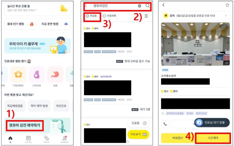 영유아검진은 대부분 당일 검진이 불가능하고, 시간 예약을 통해 가능하며 병원마다 방법이 조금씩 다른 점 참고해주세요.