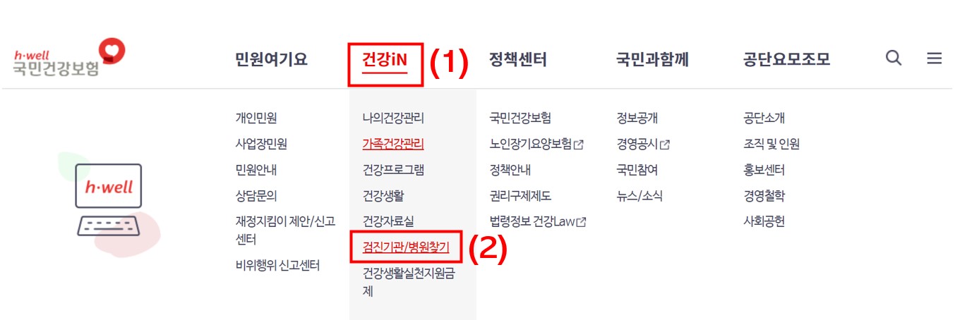 1) 건강iN(1) > 검진기관/병원찾기(2) 클릭