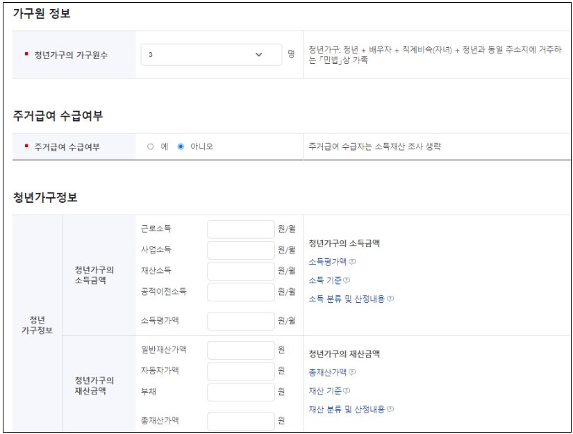 ③ 동거여부 / 청약통장 가입여부 / 혼인여부 / 지원금 수혜 여부 ~ 월 임차료(월세)까지 해당사항 선택