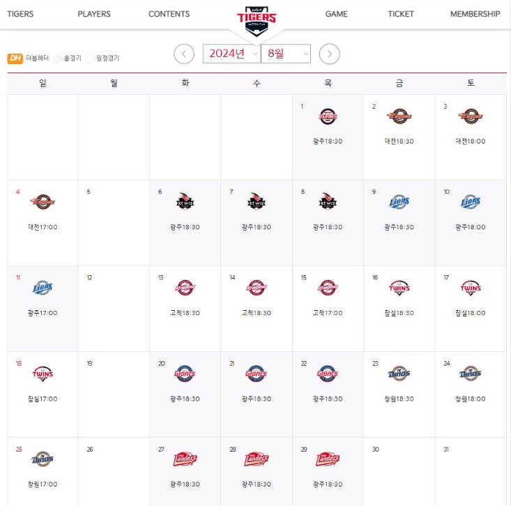 '기아타이거즈' 8월 홈경기 일정