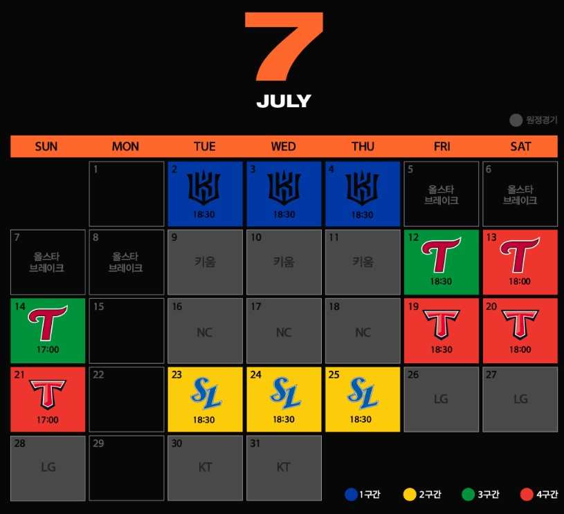 | 7/19-7/21 | 주말 | 기아타이거즈 | 4구간 |