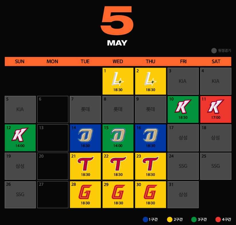 | 4/30-5/2 | 주중 | SSG랜더스 | 2구간 |