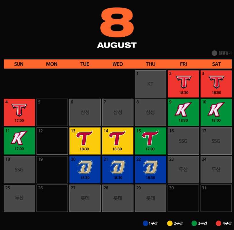 | 8/2-8/4 | 주말 | 기아타이거즈 | 4구간 |